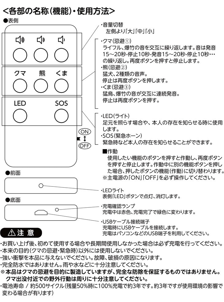 ●仕様/電源:内蔵充電池(USB端子充電仕様)、ライト:LED×1灯、充電時間:約2時間、作動時間:最大連続約4~12時間、音圧レベル:110db(最大)