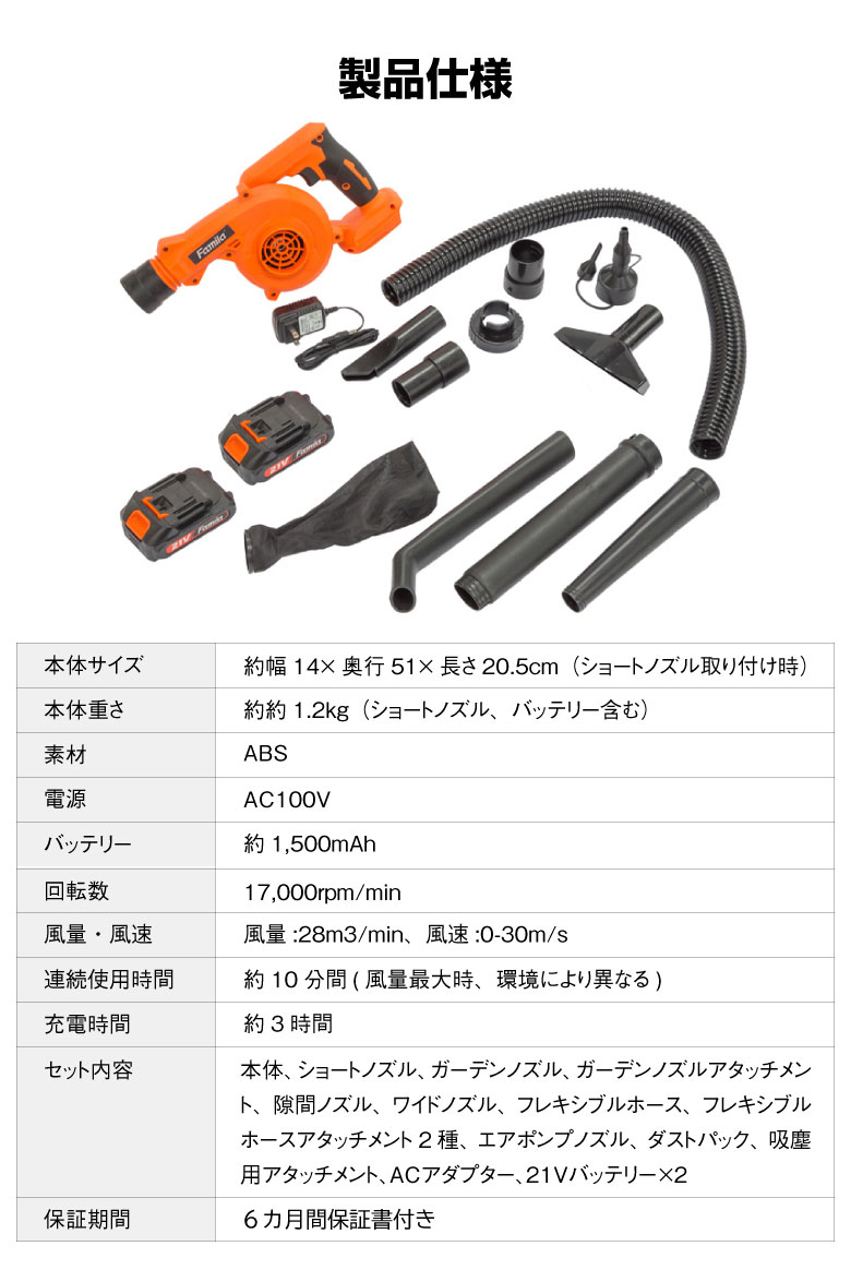 ●仕様/仕様:AC100V、充電時間:約3時間、連続使用時間(目安):約10分間(風量最大時、環境により異なる)、パッテリー容量:約1,500mAh、風量:28m3/min、回転数:17,000rpm/min、風速0-30m/s