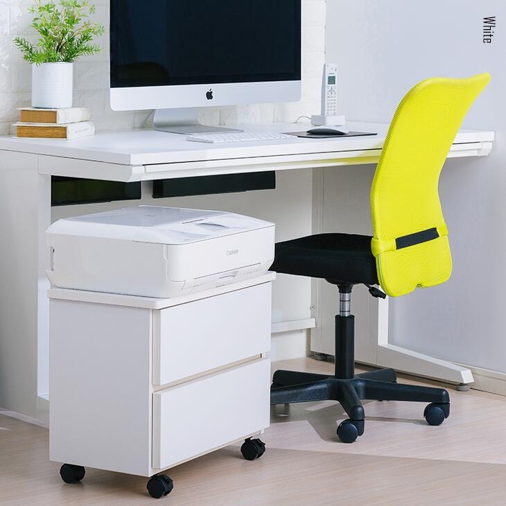 キャスター付きなので、リビングから書斎への移動も簡単です。プリンターや書類の収納に役立ち、デスク周りをすっきりと見せます。