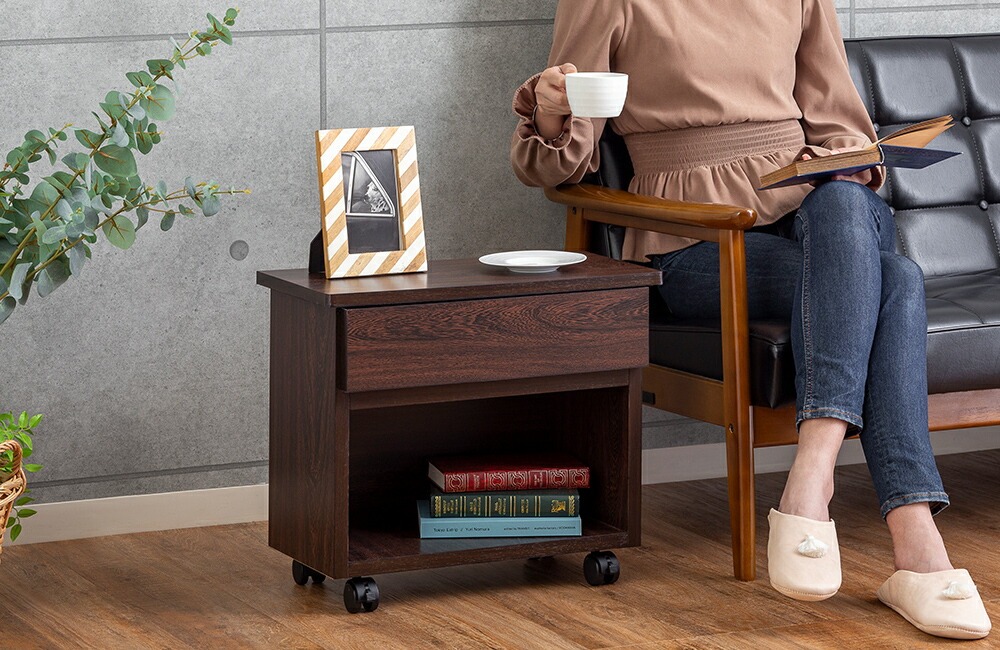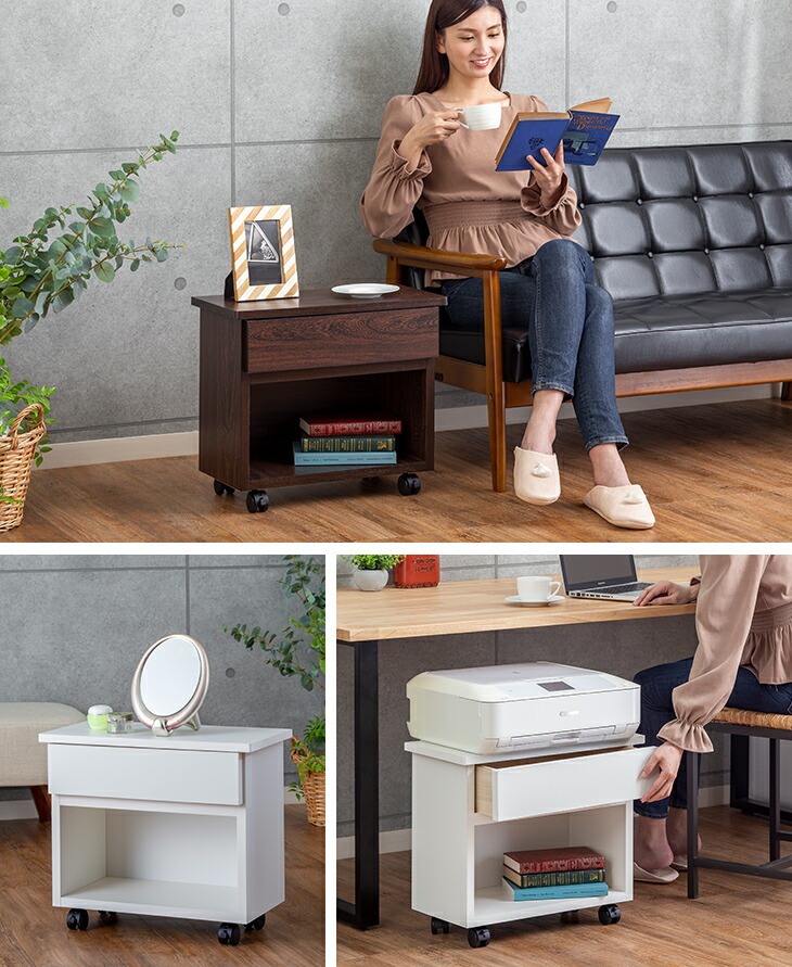 寝室に置いて、本やスマホ、飲み物などを置くのに便利です。引き出しには小物類を整理整頓して収納できます。