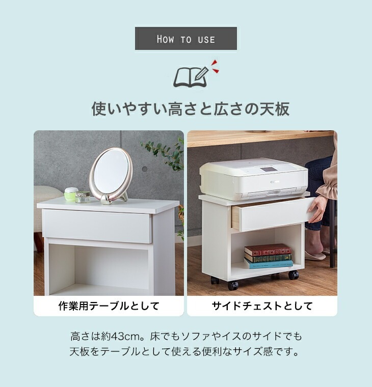 在宅ワークがもっと快適になる、引き出し付きのサイドチェストです。シンプルなデザインはどんなお部屋にも馴染み、コンパクトながらも整理整頓をサポート。作業効率を上げたい方や、お部屋をすっきりと見せたい方におすすめです。