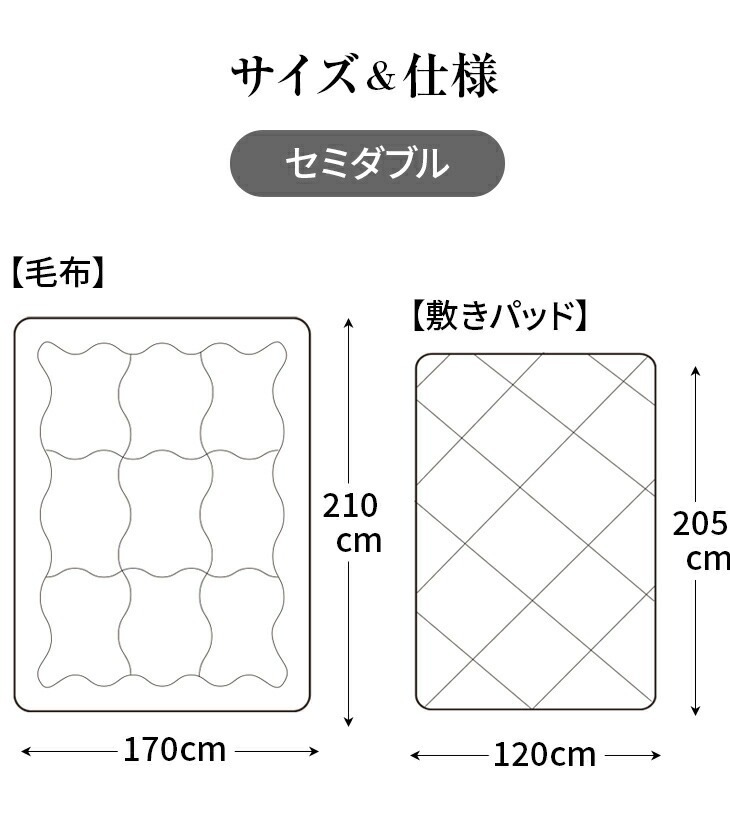 ●サイズ/掛布団:170×210cm、敷パッド:120×205cm