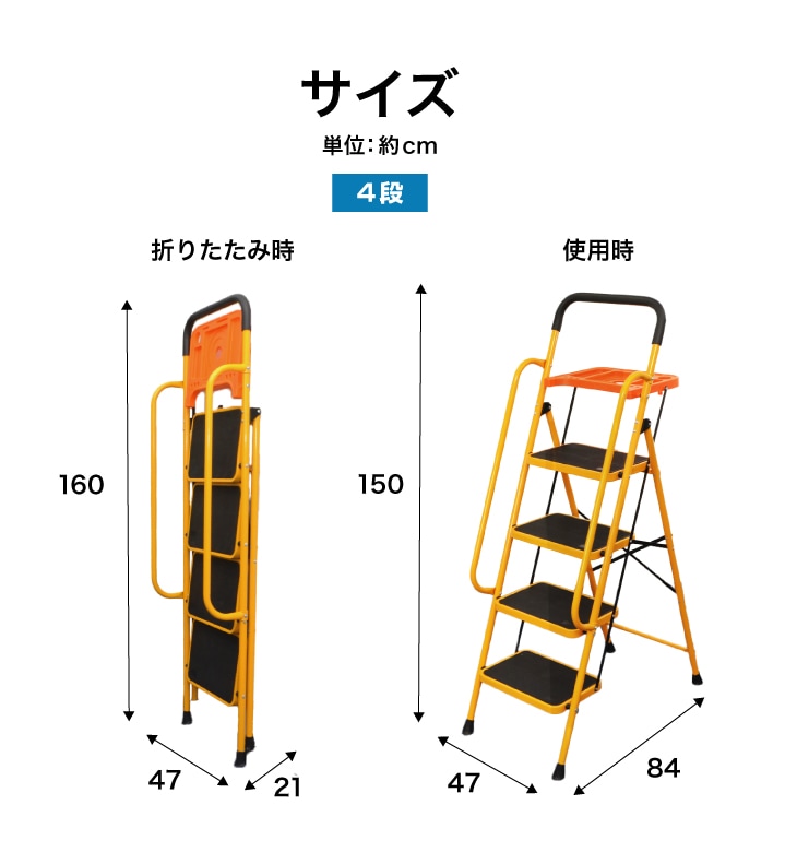 昇り降りが不安な作業も、両手すり付きで安心!踏み台部分は耐荷重約100kgで頑丈です。工具や塗料が置ける便利なトレー(耐荷重約10kg)も付いて、高所作業がはかどります。使用しない時はサッと折りたたんでコンパクトに収納可能。使いたい時に広げるだけで、すぐに使える便利な脚立です。