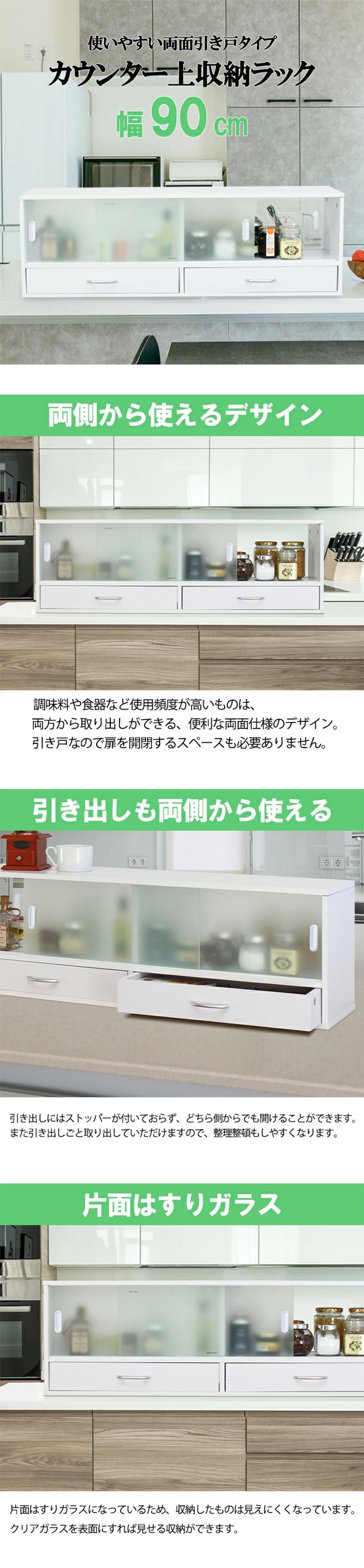 両側から使える!引き戸式キッチンカウンター上収納ラック(幅90cm)