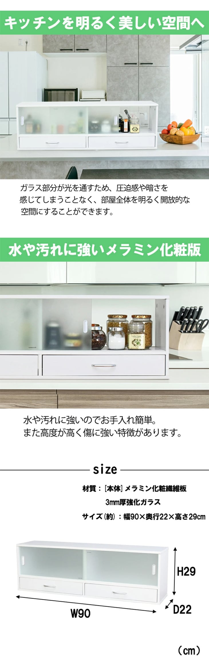 3.コンパクトなのに大容量: 奥行き約22cmとスリムながら、幅約90cmでたっぷり収納。調味料や食器、スパイスなどをまとめて整理整頓できます。天板部分も活用可能です。