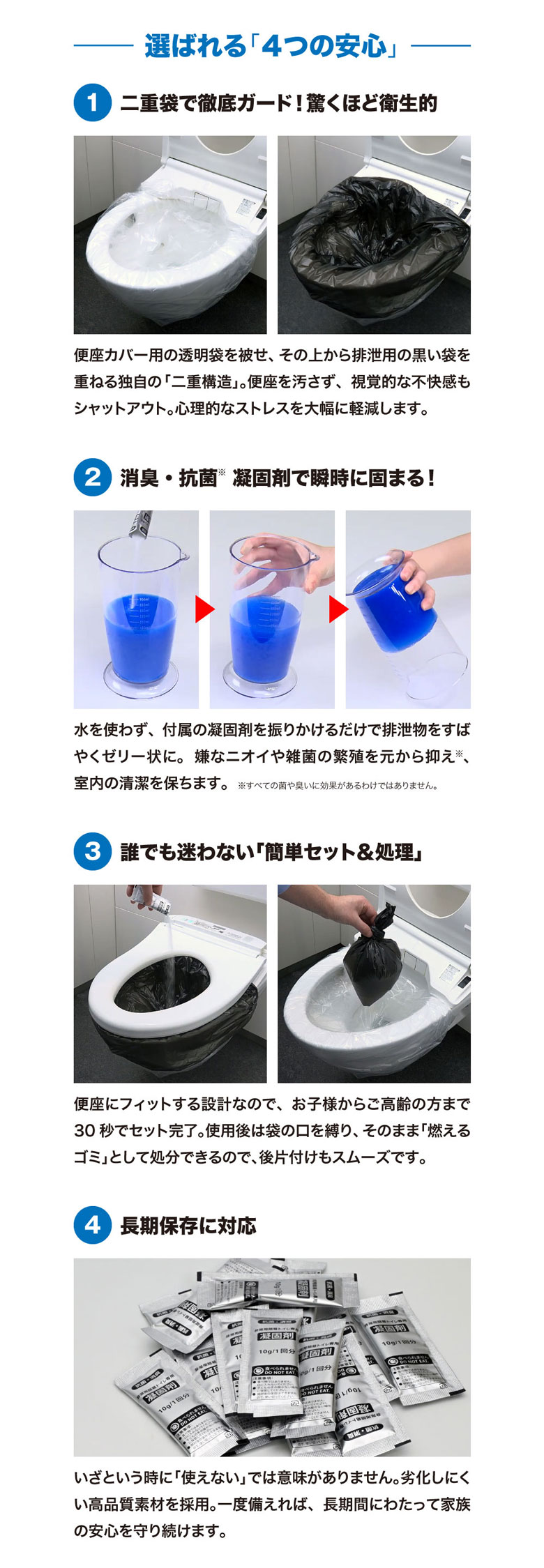 強力な「消臭・抗菌効果」で二次被害を防ぐ優れた消臭・抗菌効果を持つ高吸水性ポリマーの凝固剤を採用。尿や便を素早くゼリー状に固め、気になるニオイを閉じ込めます。避難生活でストレスになりやすい衛生面を強力にサポートします。