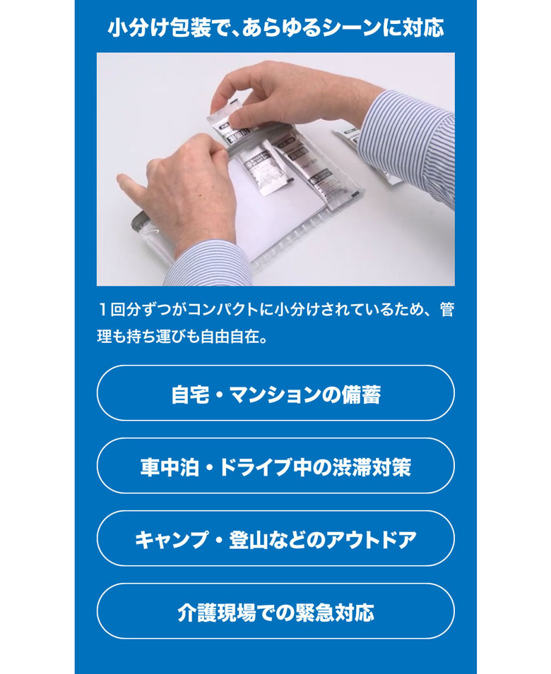 長期保管や持ち運びに便利な小分け包装を採用。防災リュックの隙間に入れたり、車載用として備蓄したりするのにも最適です。