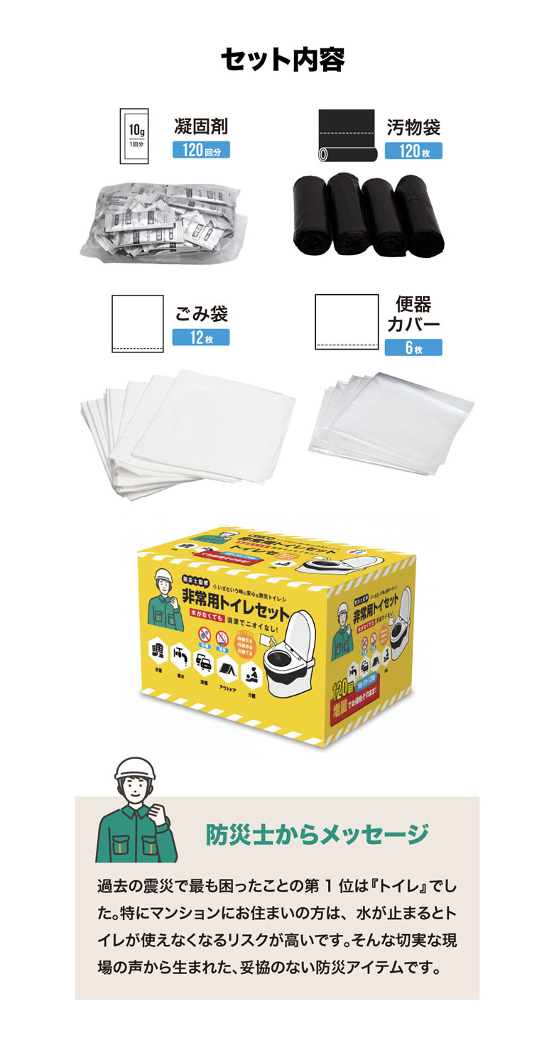 本製品は、防災のプロである「防災士」が監修。家族の安心を守るために必要な機能を凝縮した、お得で安心なトイレセットです。