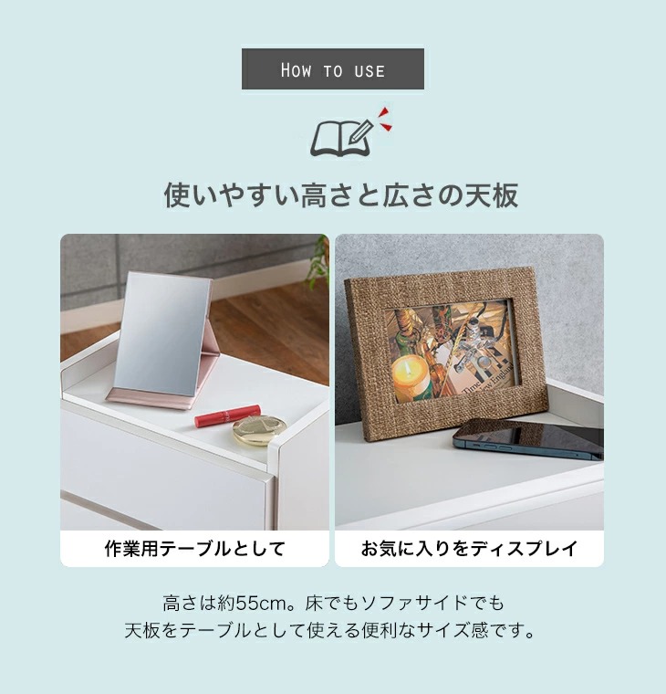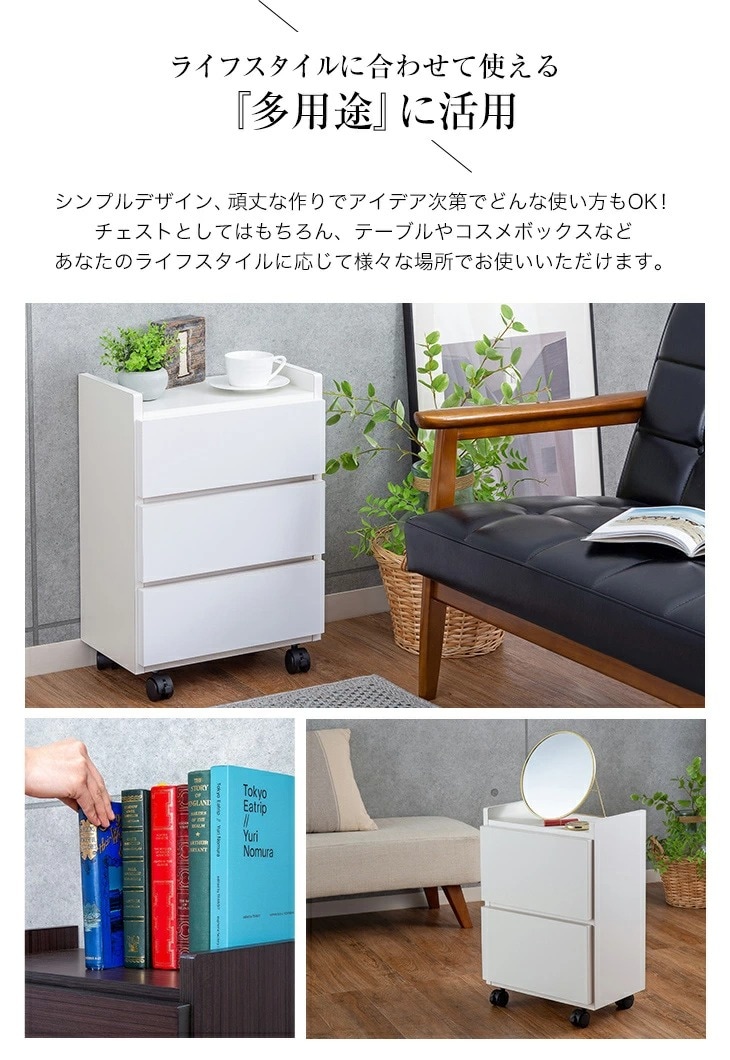 ・デスク下のワゴンやソファ脇のサイドテーブルなど様々な用途で使えて便利。