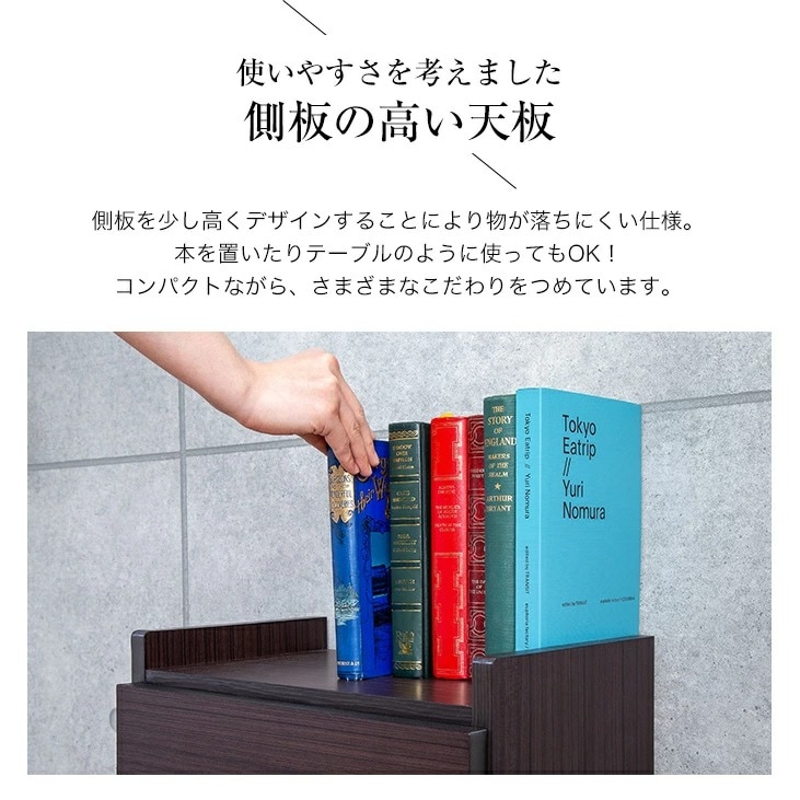 側板が天板よりも高いデザインで置いた物が落ちにくく安心です。