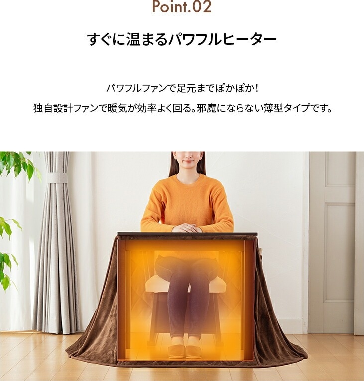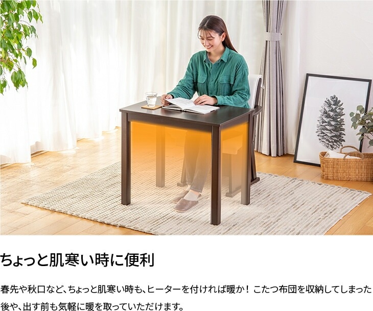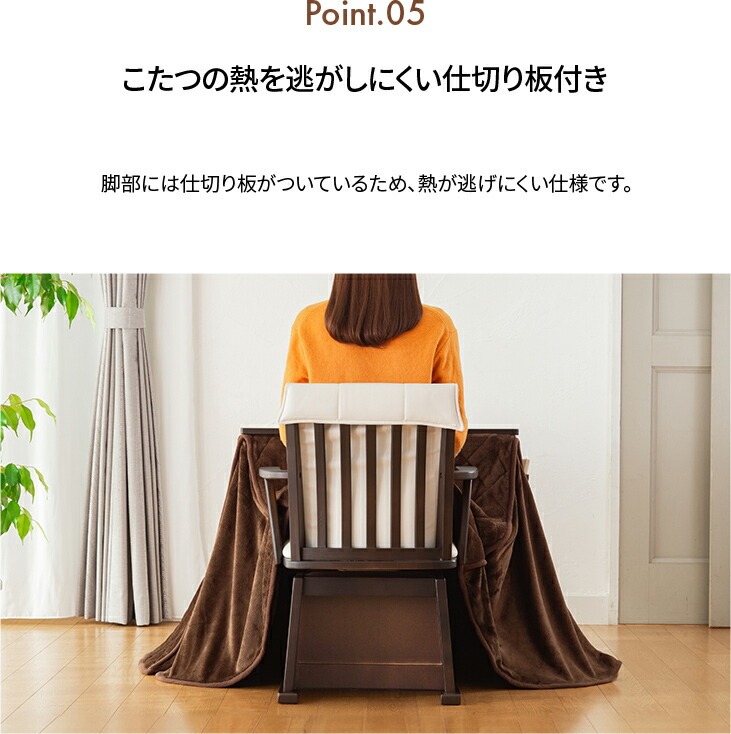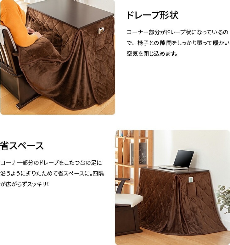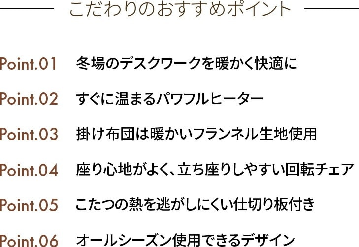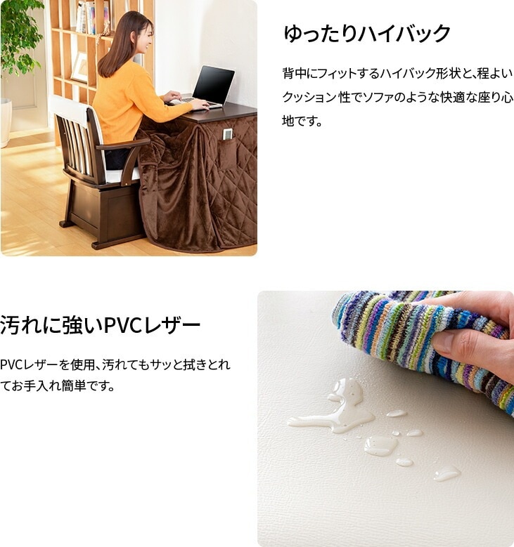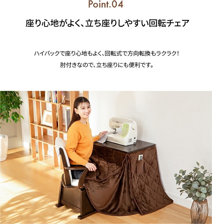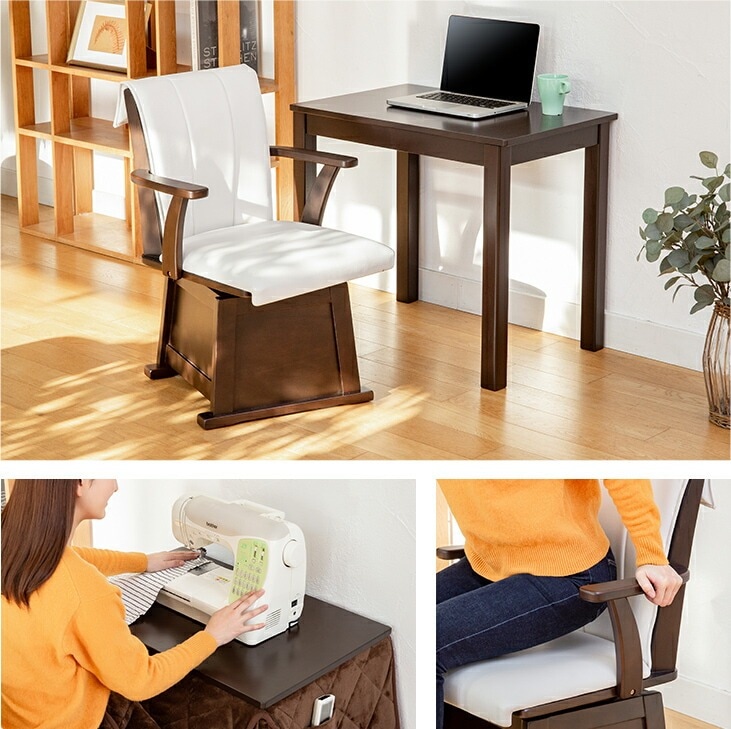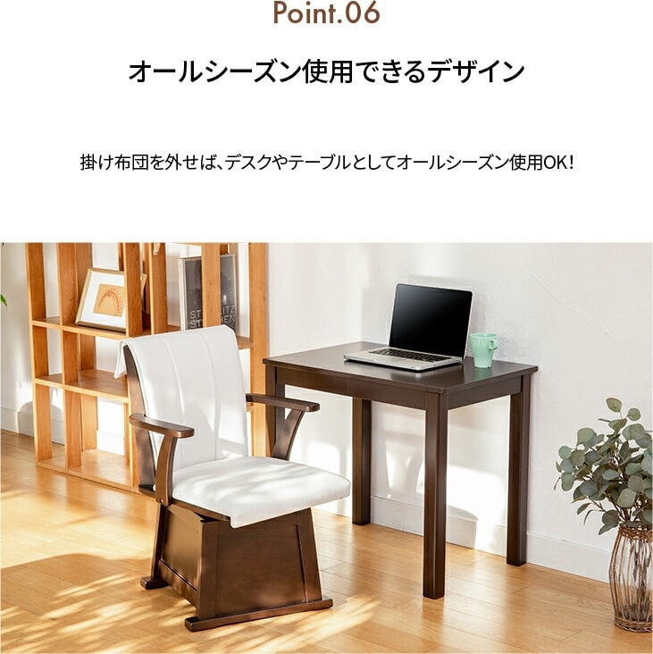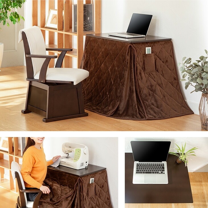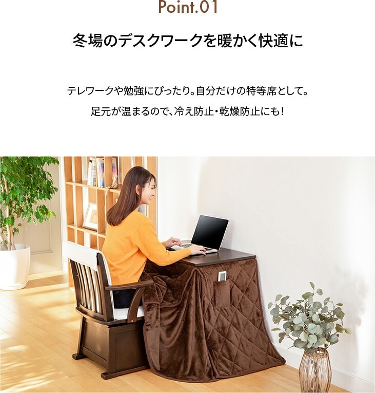 寒い季節の家事や仕事に。おひとりサイズのこたつデスク。こたつ用ヒーターがついたデスクと専用掛布団のセット。ちょっとしたスペースを活かして、あなただけの暖か空間に。ヒーターは薄型で邪魔になりません。また、独自に設計したファンで暖気が効率良く回り足元暖か。手元で使える中間スイッチ付き。布団は撥水加工仕様のフランネル生地。こたつ布団を外すと年中使用できます。厚めのクッションでお尻に負担がかかりにくく、座り心地が良いチェア。座面はお手入れ しやすいPVCレザー張り。熱が逃げない仕切り板付きの360度回転するコタツ用チェアです。