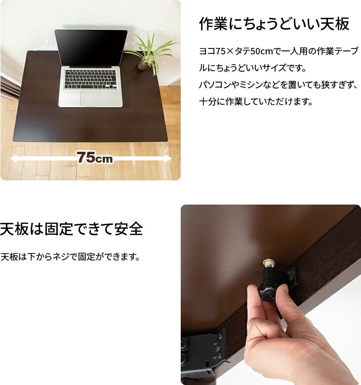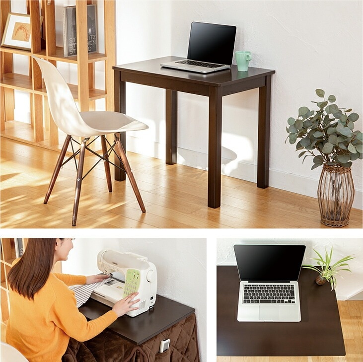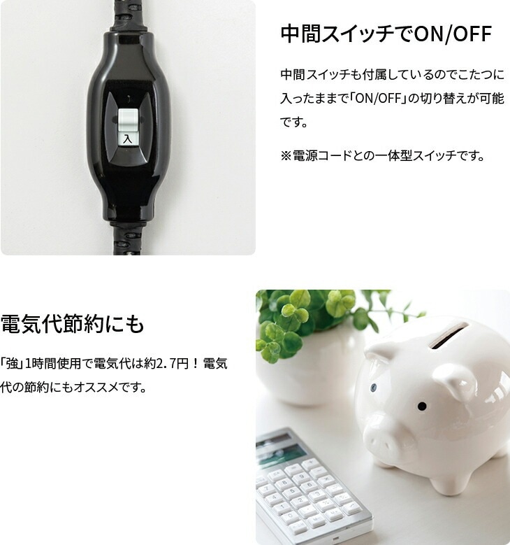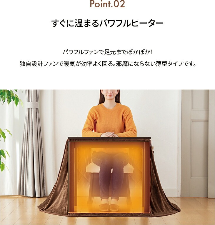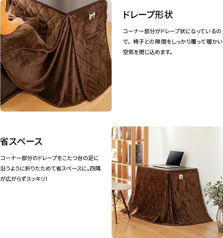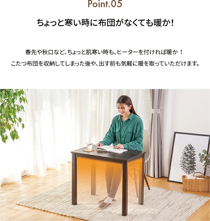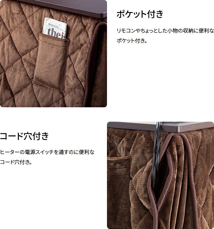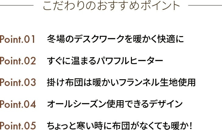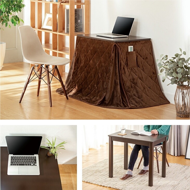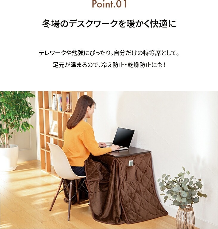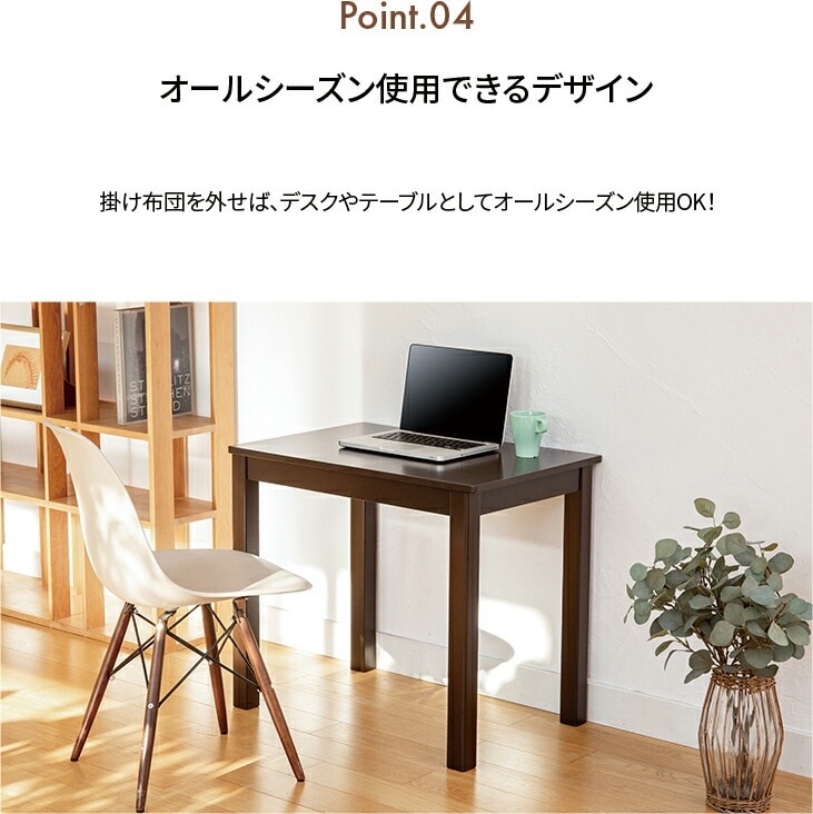 寒い季節の家事や仕事に。おひとりサイズのこたつデスク。こたつ用ヒーターがついたデスクと専用掛布団のセット。ちょっとしたスペースを活かして、あなただけの暖か空間に。ヒーターは薄型で邪魔になりません。また、独自に設計したファンで暖気が効率良く回り足元暖か。手元で使える中間スイッチ付き。布団は撥水加工仕様のフランネル生地。こたつ布団を外すと年中使用できます。