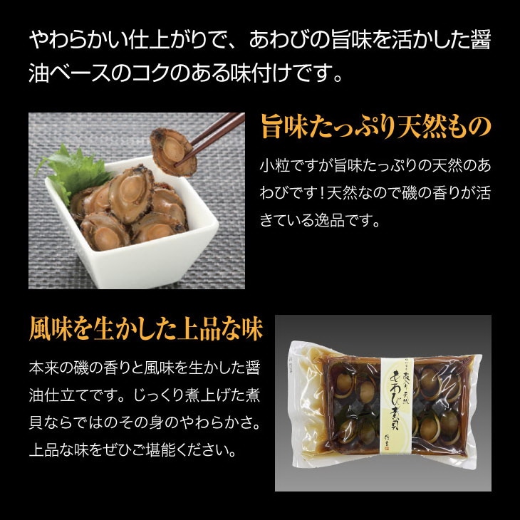 やわらかい仕上がりで、あわびの旨味を活かした醤油ベースのコクのある味付けです。じっくり煮上げた煮貝ならではのその身のやわらかさ。上品な味をぜひご堪能ください。小粒ですが旨味たっぷりの天然のあわびです。天然なので磯の香りが活きている逸品です。殻は器としてもご利用頂けます。高温殺菌をしておりますので常温で保存できます。