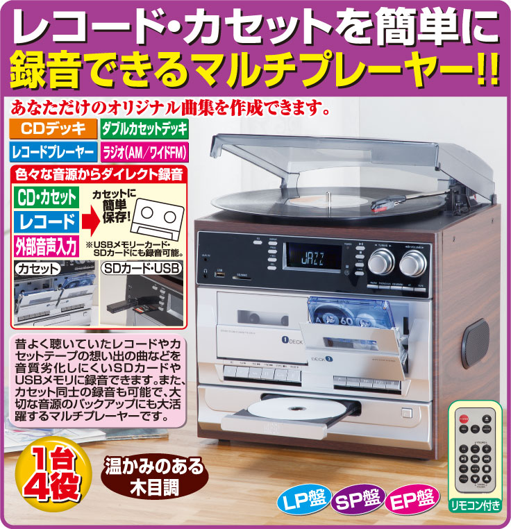 レコードLP・SP・EP盤に対応/カセットテープ/CD/AM・FMラジオ(ワイドFM対応)/SDカード・USBメモリ
