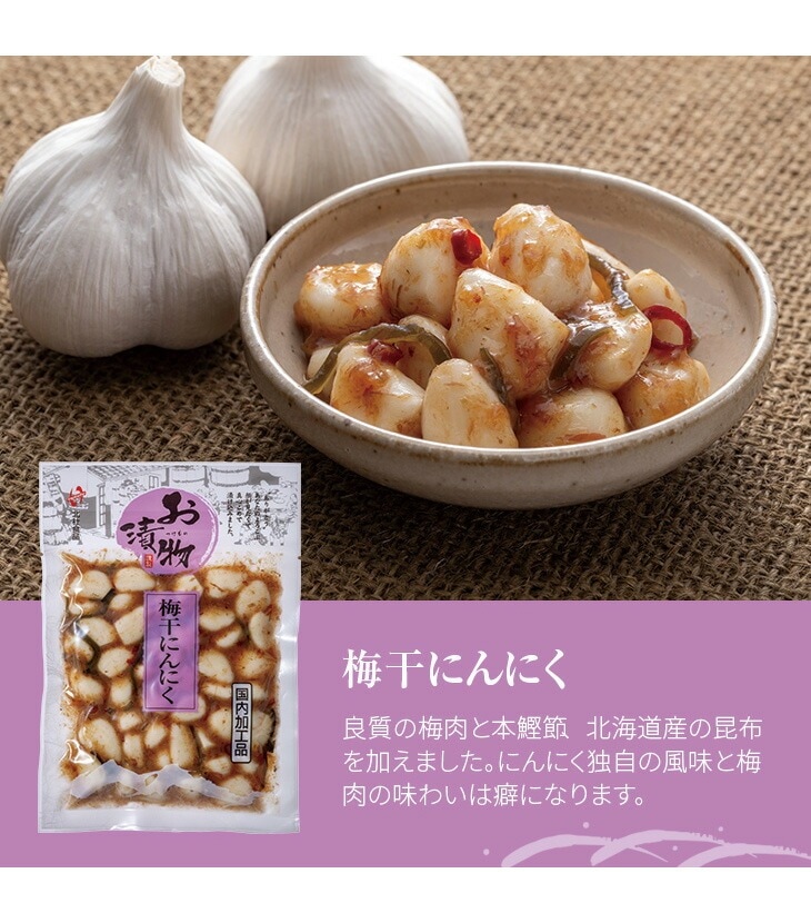 梅干にんにく:にんにくに良質の梅肉と本鰹節、そして北海道産の昆布を加えました。にんにく独自の風味と梅肉の味わいは癖になります。
