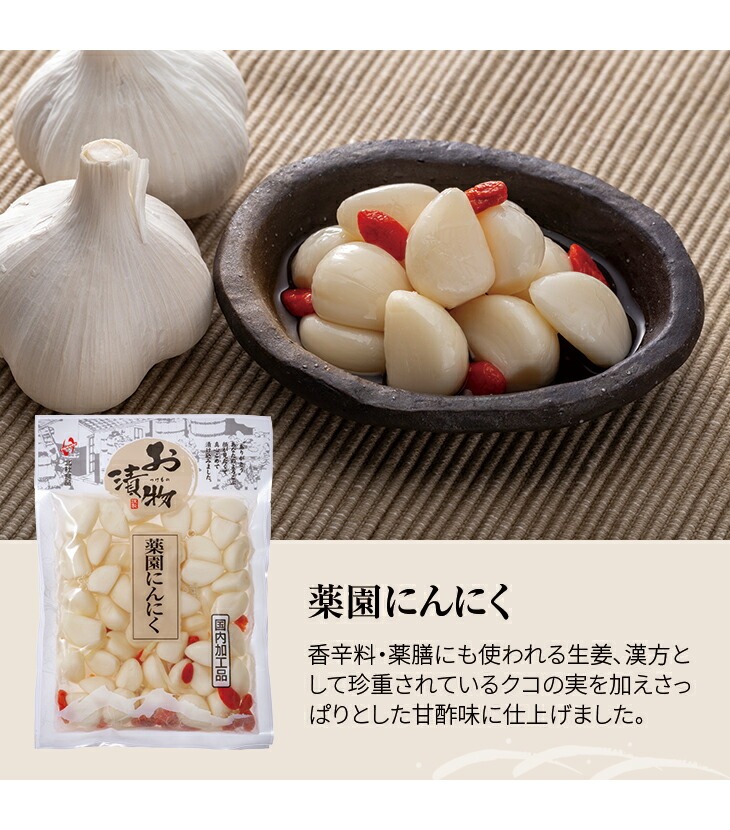 薬園にんにく:にんにくに香辛料・薬膳にも使われる生姜、漢方として珍重されているクコの実を加えて、さっぱりとした甘酢味に仕上げました。