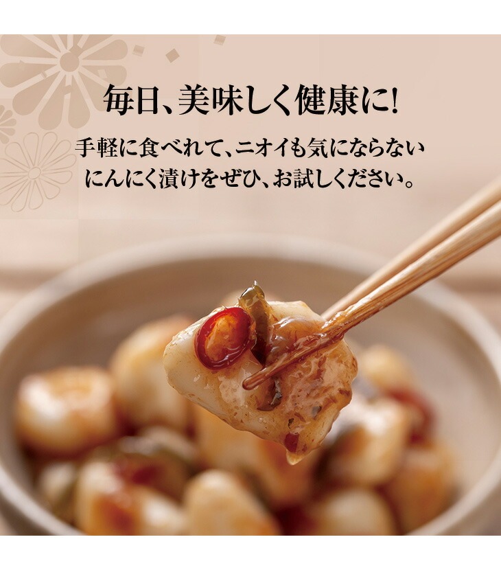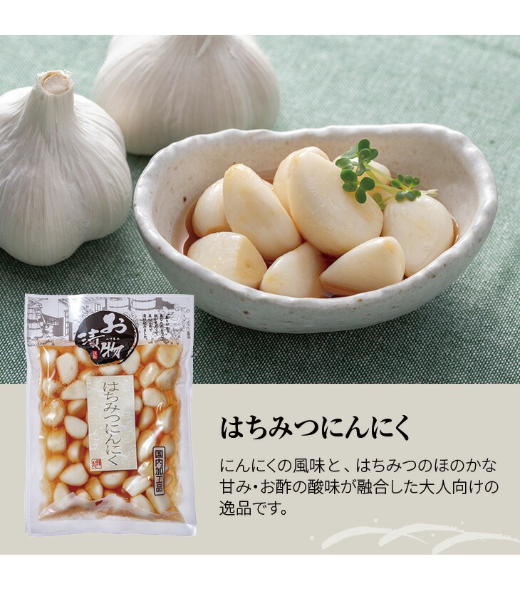 はちみつにんにく:にんにくの風味と、はちみつのほのかな甘み・お酢の酸味が融合した大人向けの逸品です。