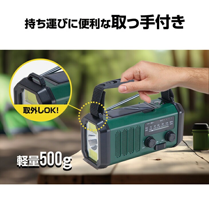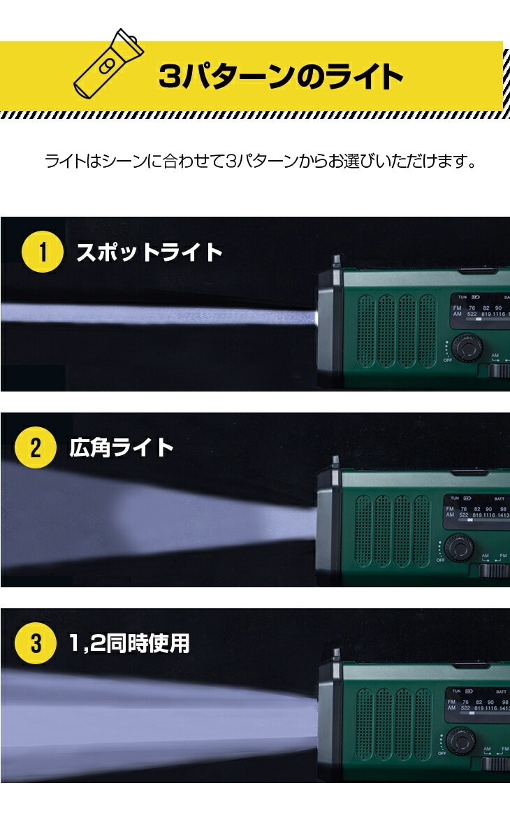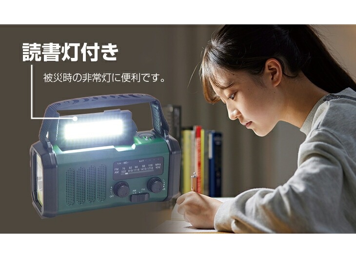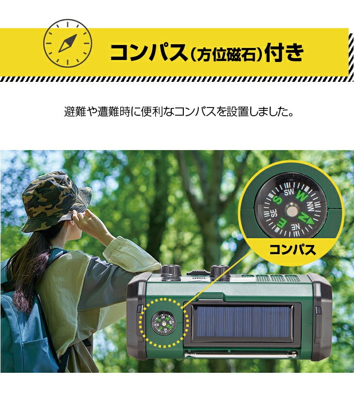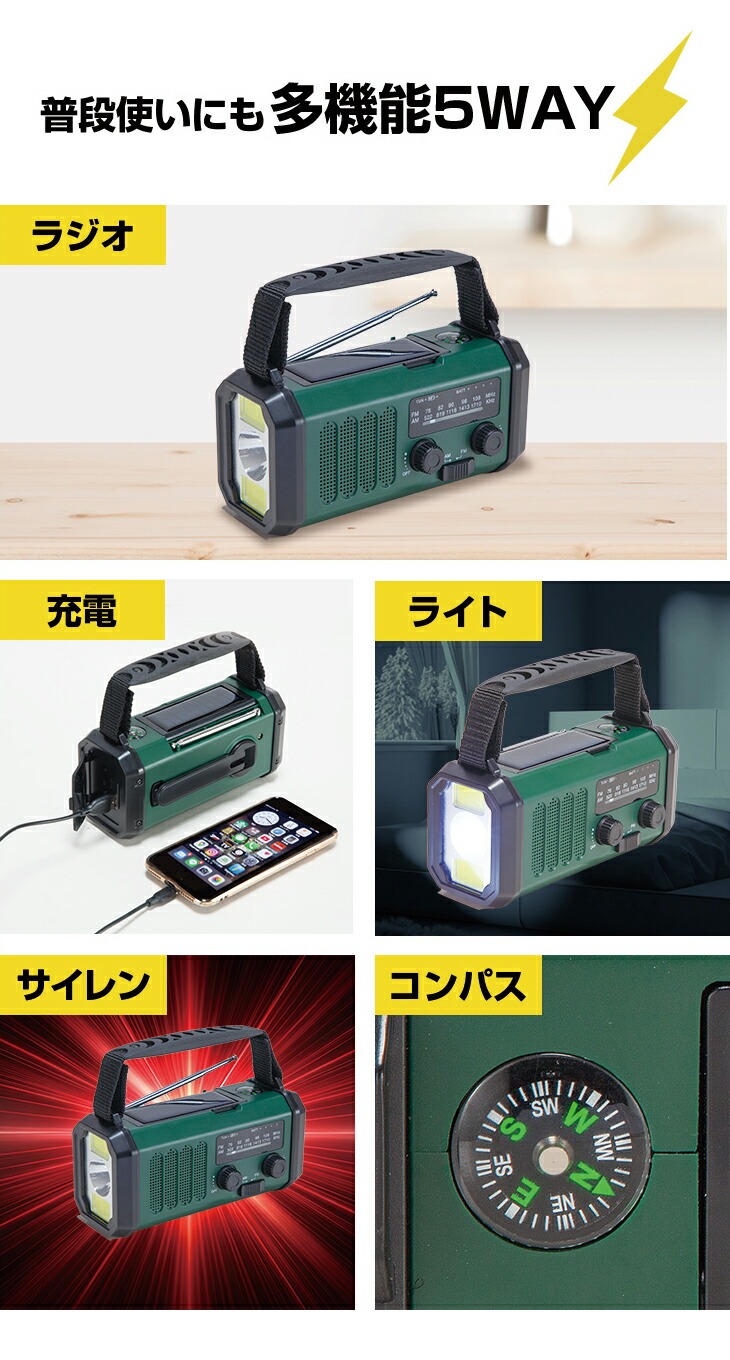 4.緊急時に役立つ機能: 救助や防犯に有効なSOSサイレン、方向を確認できるコンパス、手元を照らす読書灯を搭載。さらにFM/AMラジオで広範囲の情報収集が可能です(ワイドFM対応)。