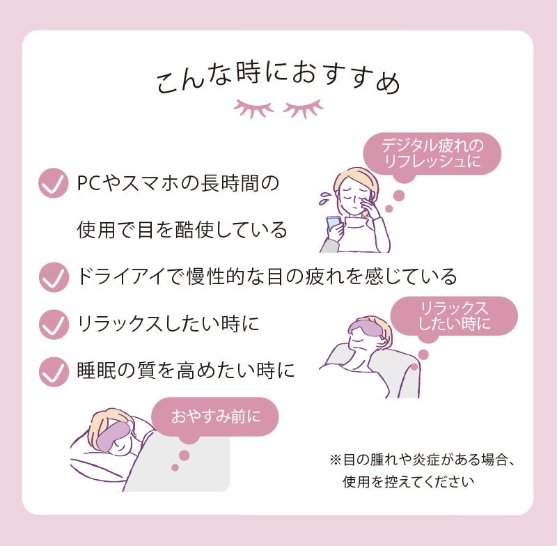 累計販売数80万台を突破した「めめホット」が、つけ心地を追求して新登場!カバー表面にシルク100%素材を使用し、なめらかな肌触りを実現しました。充電式コードレスなので、場所を選ばずいつでもどこでも、毎日のセルフケアにぴったりです。