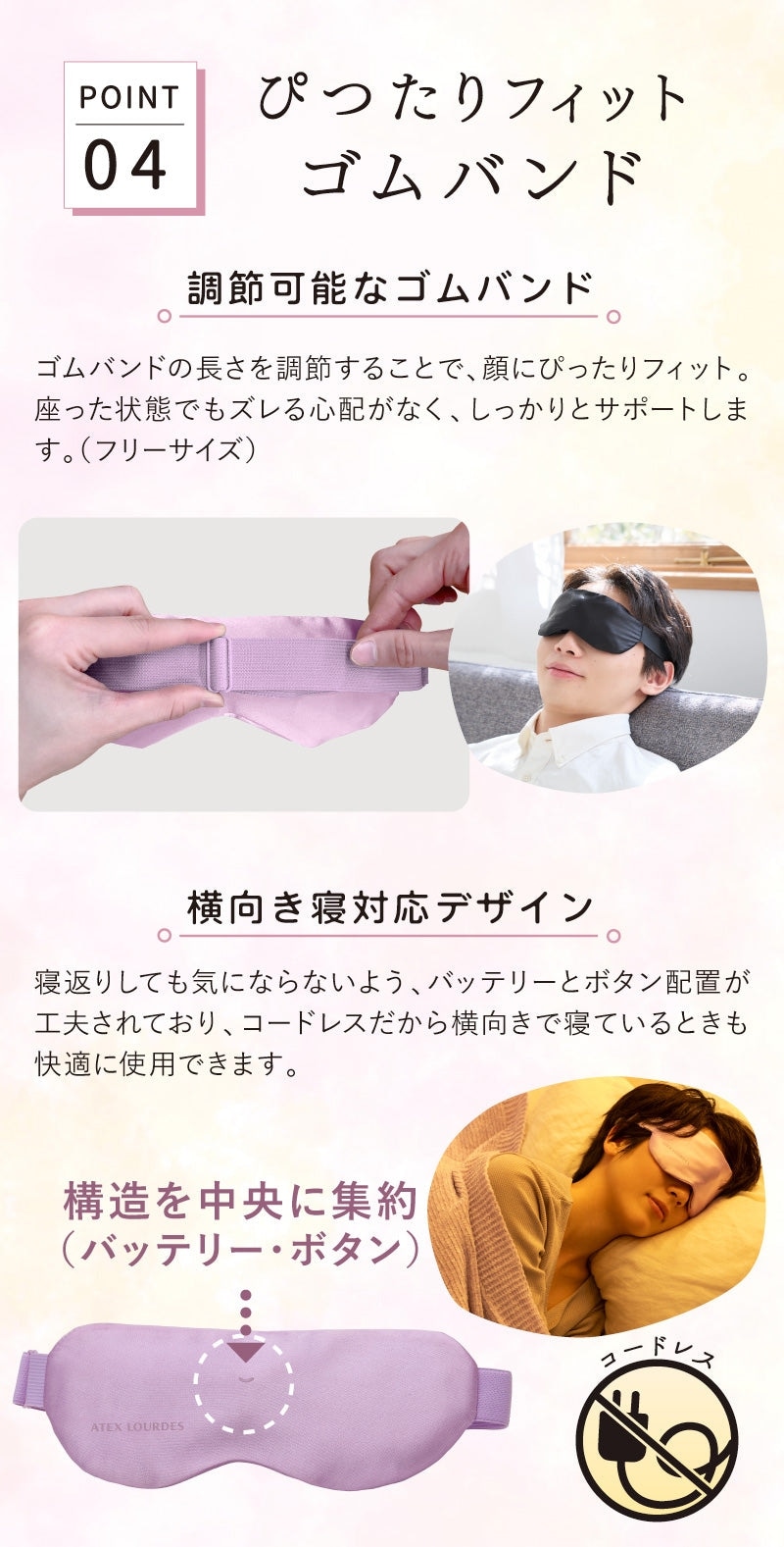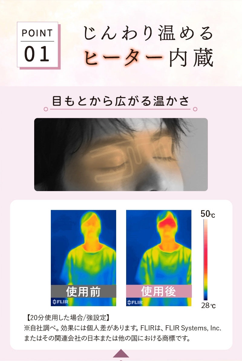 3段階の温度調節機能は、つけたまま手軽に調整可能。設定時に音でお知らせしてくれるので、いちいち外す必要がありません。強設定で20分間使用すると、目元だけでなく首や腕まで温かさがじんわりと広がり、全身がリラックスしていくのを感じられます。約50gの軽量設計に加え、調節可能なゴムバンドで顔にぴったりフィット。座った状態でもズレる心配がありません。また、横向きで寝ているときも快適に使用できるよう、バッテリーとボタンの配置にもこだわりました。カバーは取り外して洗えるので、いつでも清潔に保てます。