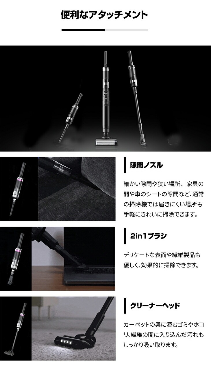●付属品/隙間ノズル、2in1ブラシ、お手入れブラシ、スポンジフィルター、スポンジフィルターユニット、HEPAフィルター、収納充電スタンド、電源アダプター、バッテリーパック、延長パイプ、吸引ヘッド、UVミニヘッド