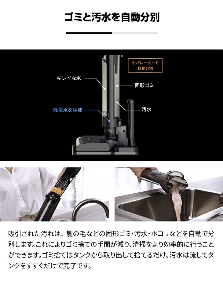 吸い込んだゴミは自動分別され、ゴミ捨ても簡単。