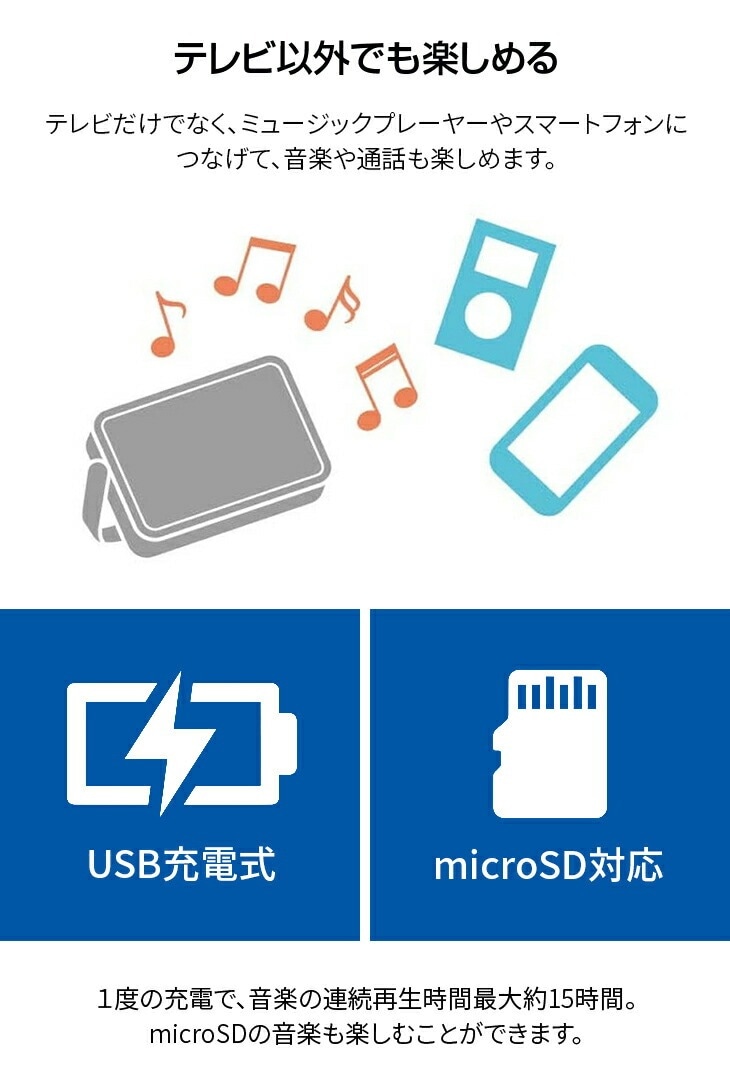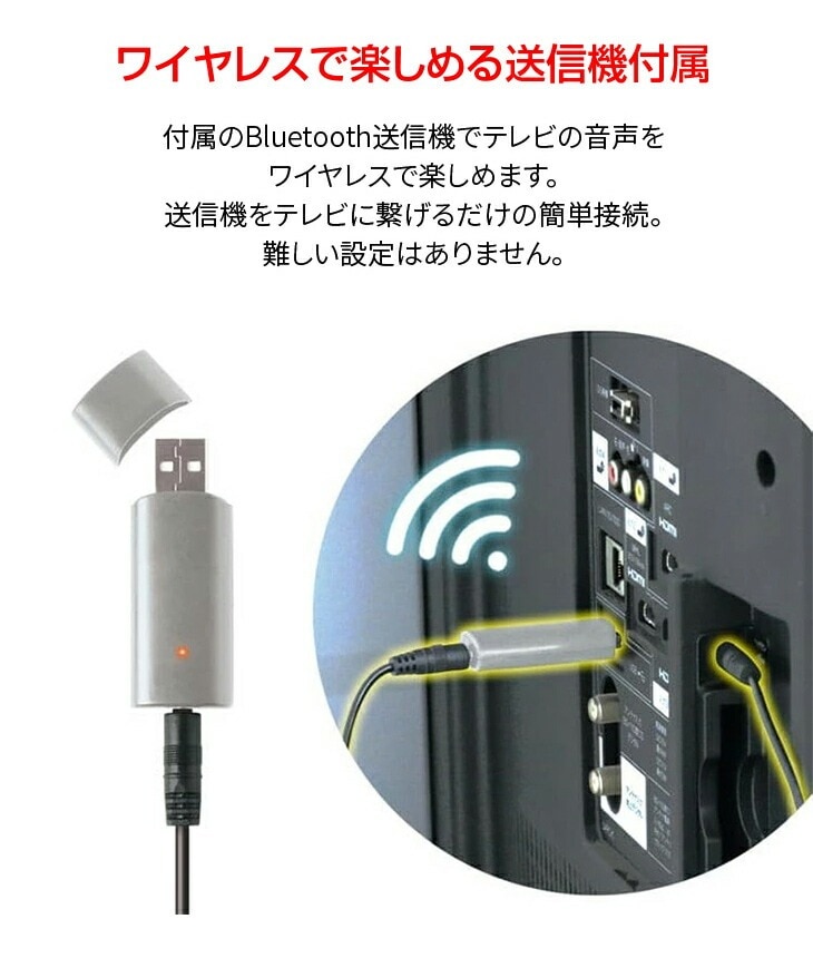 ●備考/[本体]バージョン:Bluetooth標準規格 Ver.5.0・class2、電源:DC3.7V内蔵リチウムイオン充電池 1500mAh、伝送距離:最大約10m、充電時間:約4時間、連続再生時間:約15時間、[送信機]バージョン:Bluetooth標準規格 Ver.5.1、class2、電源:USB電源