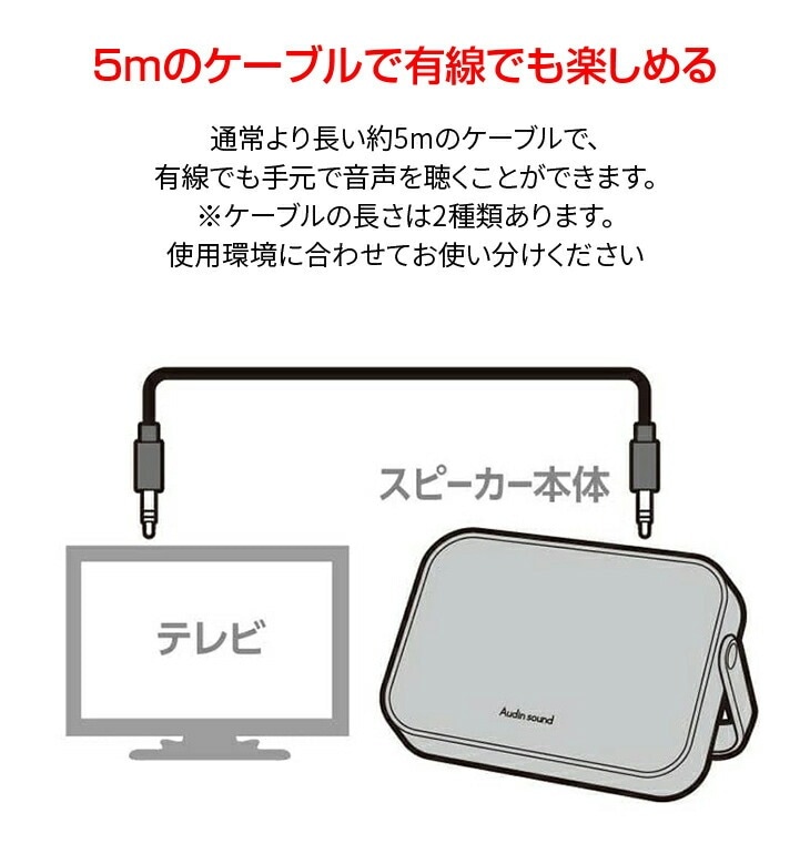付属のBluetooth送信機を使えば、テレビから離れた場所でもワイヤレスで音声を楽しめます。さらに、5mのロングオーディオケーブルも付属しているので、充電を気にせず有線でも使えます。