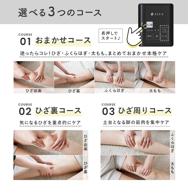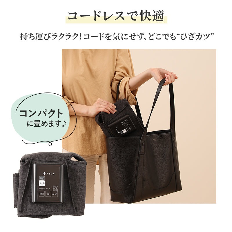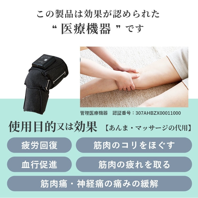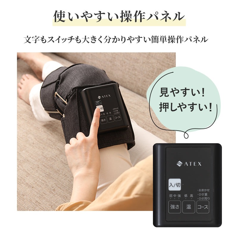 ひざの神経痛・筋肉痛を和らげる「ひざカツ」がさらに使いやすく新登場。もみ範囲もマッサージコースも増えて新登場。ひざ、ひざ裏、太もも、ふくらはぎを26層のエアバッグで一気にもみほぐす。3つのコースで27通りのマッサージ。面ファスサー式で簡単脱着。大きめ操作パネルで見えやすく押しやすく。充電式コードレス、好きな場所で気軽に使用。