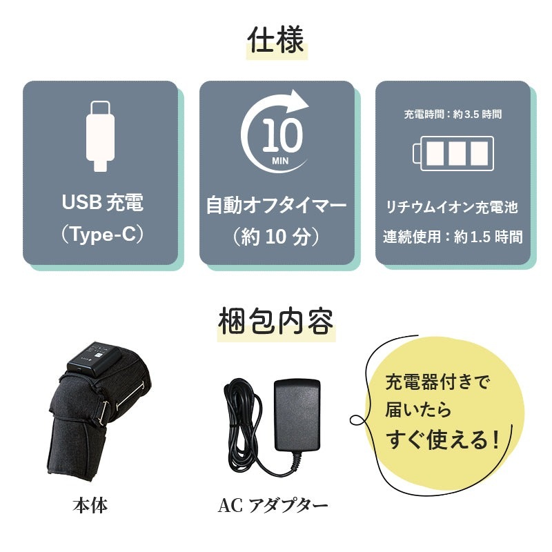 ●仕様/電源:AC100V 50/60Hz、消費電力:10W(ヒーター4W)、ヒーター温度:低(約42℃)・高(約47℃)、連続使用時間:約1.5時間、充電所要時間:約3.5時間、タイマー:約10分自動オフ、エアー圧力:約90KPa