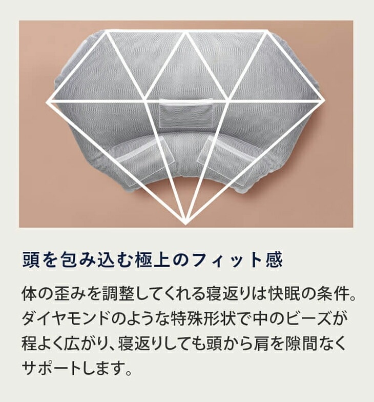 中素材には、適度な柔軟性と反発性を持つエルゴビーズを使用。頭や首の形に合わせて枕がフィットするため、まるでオーダーメイドのような寝心地を実現。通気性にも優れており、一年中快適にお使いいただけます。
