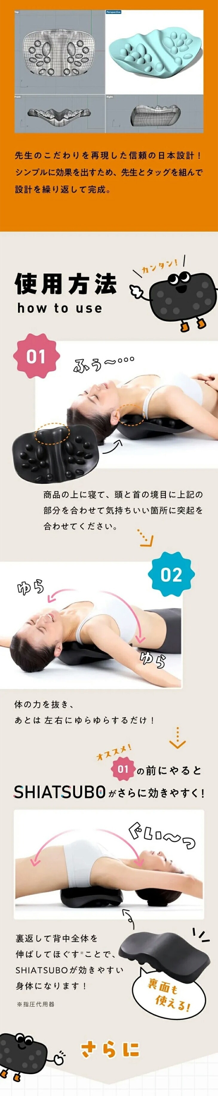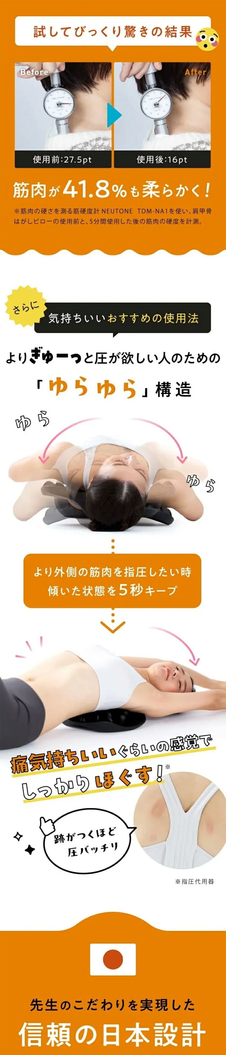 このピローは、背中や肩甲骨周りの筋肉を効率よく刺激するために設計されています。