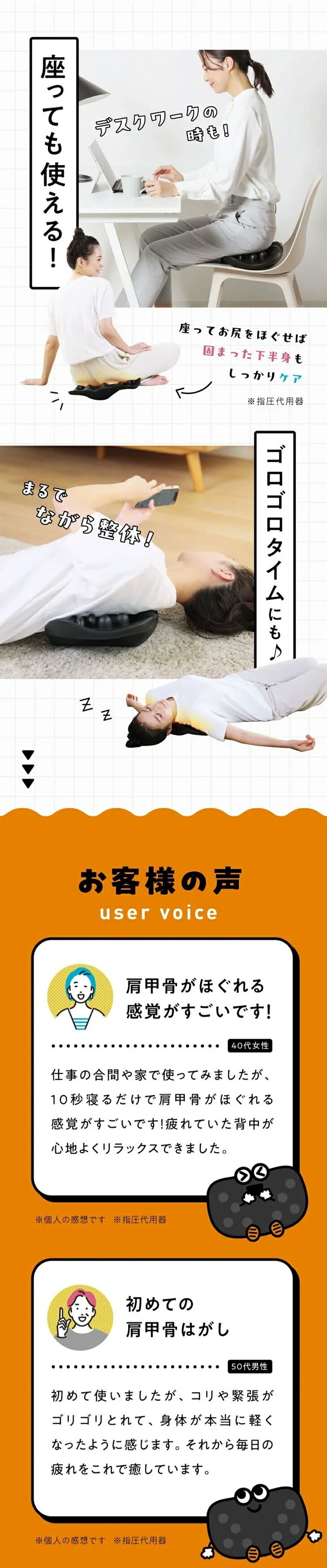 ・指圧を再現: 18個の突起が、寝転がって左右にゆらゆら揺れる動きを利用し、体重をかけて強力に指圧します。