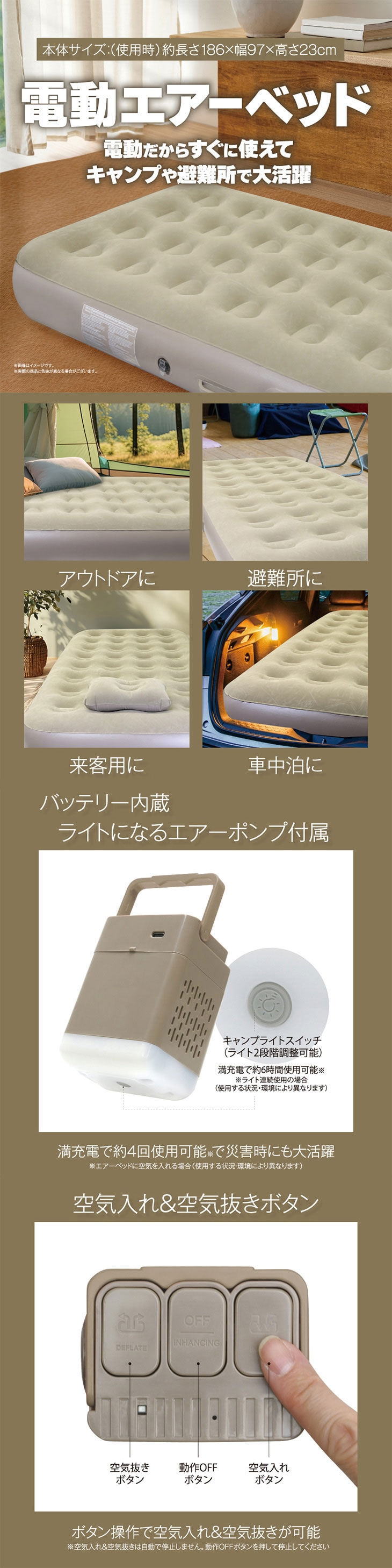 「キャンプや避難所で、すぐに快適な寝床が欲しい」「空気入れが面倒なエアーベッドは嫌だ」そんなお悩みを解決する、バッテリー内蔵電動ポンプ付きの充電式エアーベッドです。ポンプをセットしてスイッチを入れるだけで、約60秒であっという間に膨らみます。コンセントがない場所でも使えるコードレス仕様なので、アウトドアや災害時の非常用ベッドとして大活躍します。
