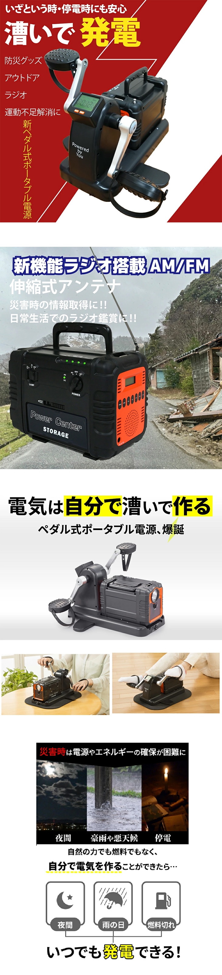 3.悪天候でも電源確保&運動不足解消: 雨や雪などの悪天候でも、室内でペダルを漕いで電源を確保可能。電気をためながら、同時に運動不足も解消できる、一石二鳥のアイテムです。