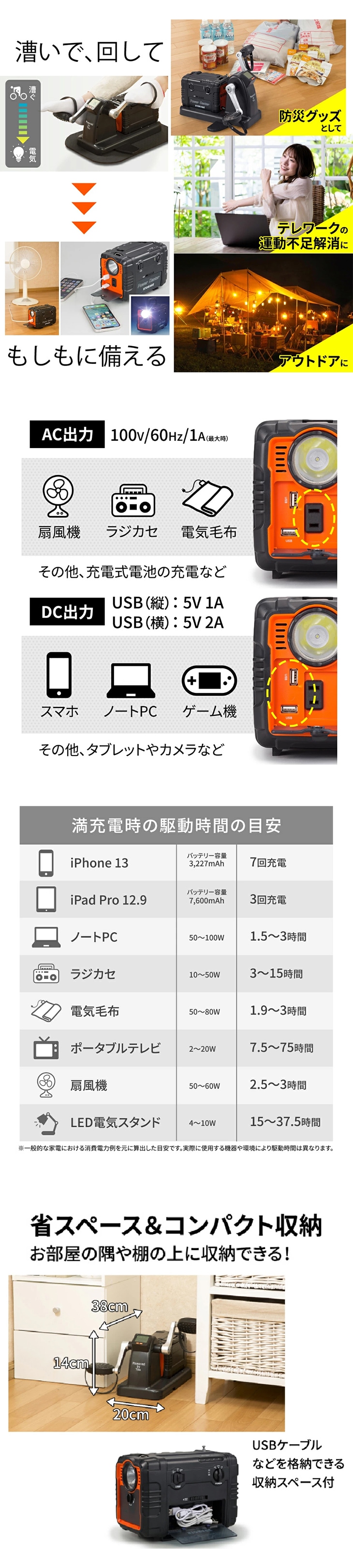 ●仕様/ACアダプターコード長:約2m、USBケーブルコード長:約60cm、充電時間:(空から満充電まで)漕いで充電する場合:約23~25時間 ※漕ぐ速度による、アダプターで充電する場合:約23時間、充電回数:約500回、内蔵電池容量:リチウムイオンバッテリー・DCの場合52500mAh・ACの場合17500mAh、内蔵電池スペック:電流17.5A・電圧12.6V・総電力220.5Wh、LEDライト:100~130ルーメン、本体入力:15V 1.5A、本体出力:AC100V 1A・DC5V 5A、スピーカー出力:5W