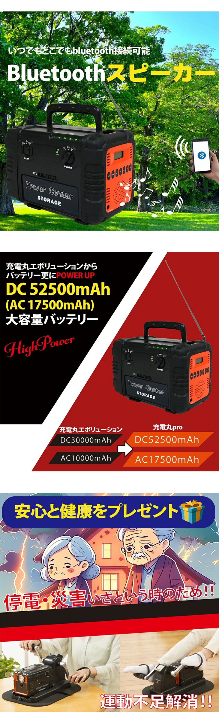 2.新機能!ラジオ&Bluetoothスピーカー: 災害時に役立つラジオ機能を搭載。さらに、音楽を楽しめるBluetoothスピーカー機能も付属し、避難所やアウトドアでの楽しみが広がります。