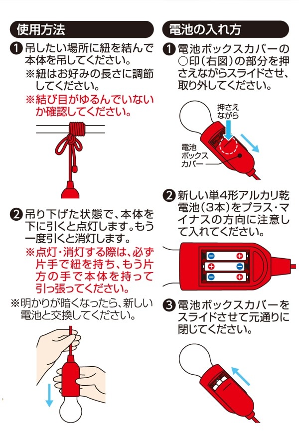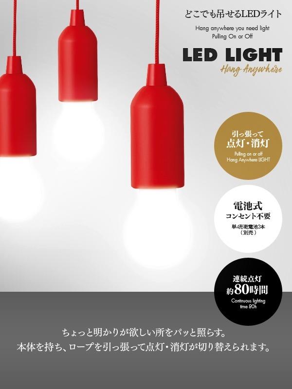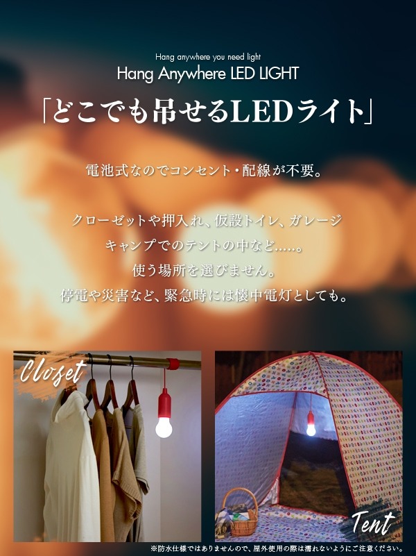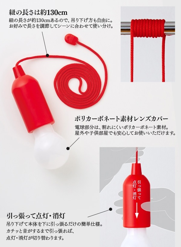 「クローゼットや押し入れの中など、ちょっとした暗がりに灯りが欲しい」「非常時やキャンプの備えになる、手軽なライトを探している」そんな願いを叶える、吊り下げ式のLEDライトです。紐を引っ張るだけで、点灯・消灯が簡単。電池式でコンセントが不要なので、電源のない場所や、場所を選ばずにどこでも設置できます。