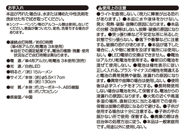 ●仕様/電源:単4アルカリ乾電池3本使用(別売)、光源:白色LED、明るさ:約15ルーメン