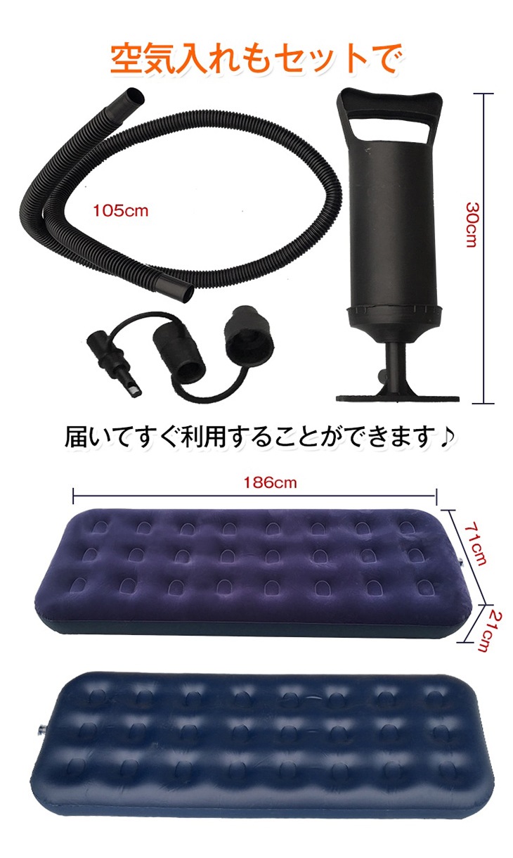2.専用の手動ポンプ付きで、どこでも設置OK: 電源不要の手動。空気入れ(ポンプ)とホースがセット。コンセントがないアウトドアシーンや車中泊、緊急時の簡易ベッドとしても、場所を選ばずすぐに膨らませることができます。
