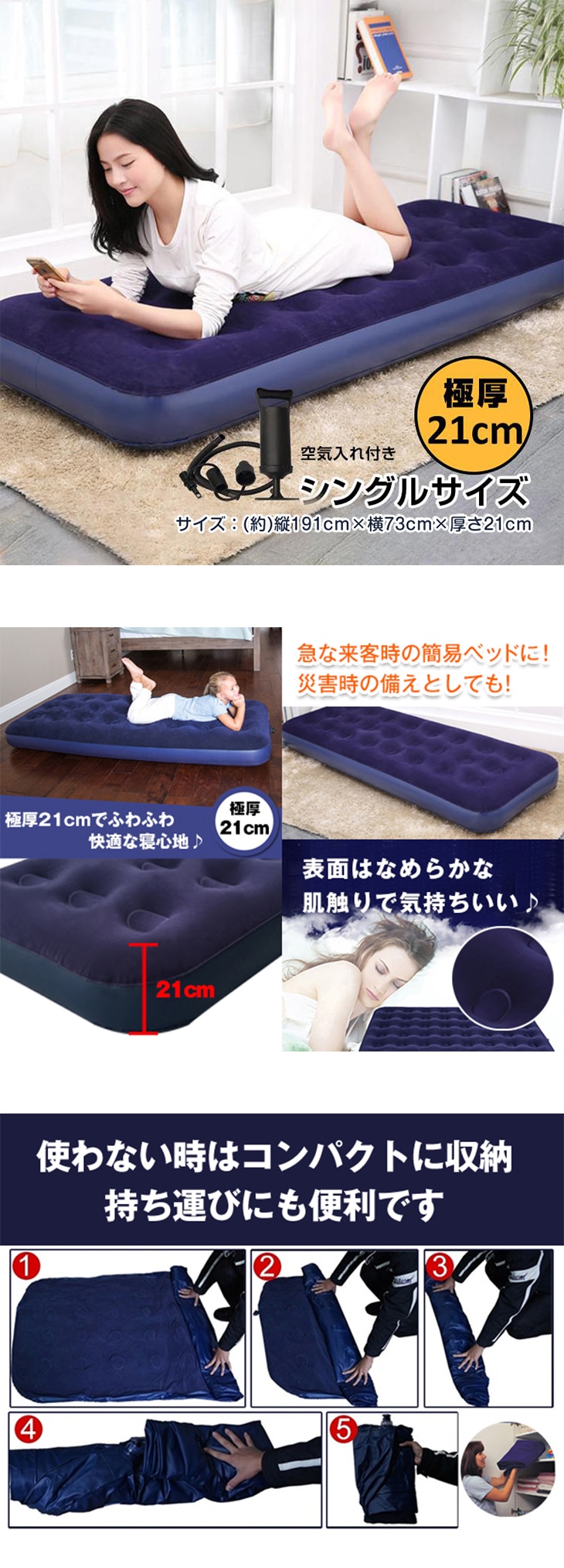 極厚21cmで快適な寝心地!持ち運びも便利な手動ポンプ付き「エアーベッド」