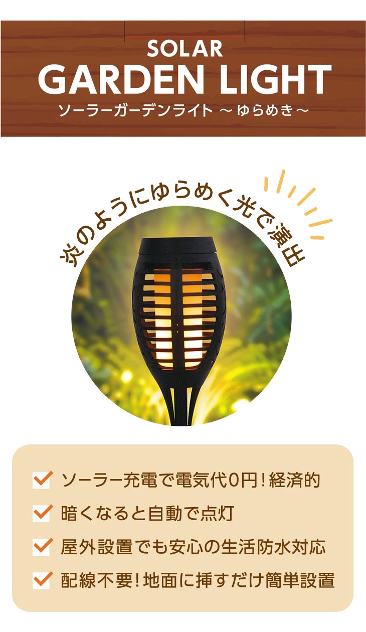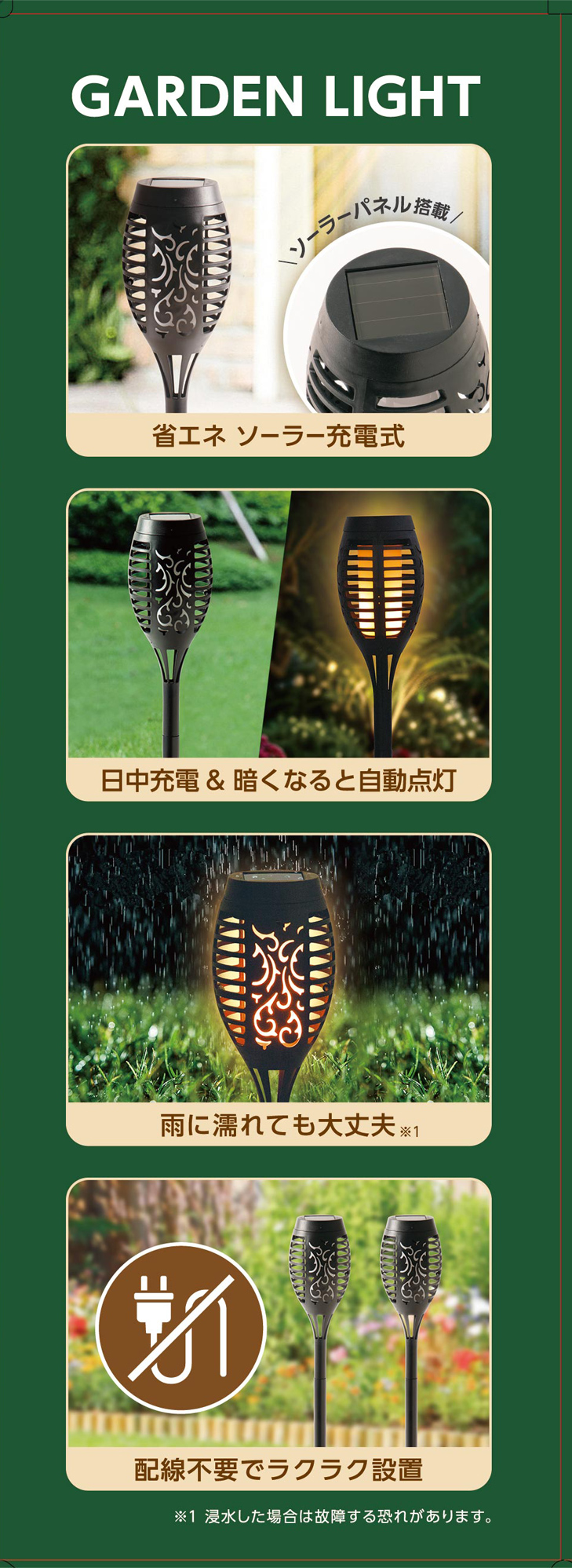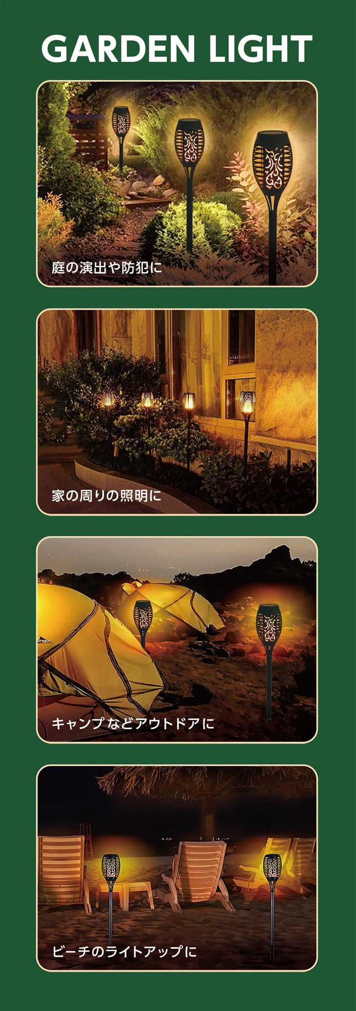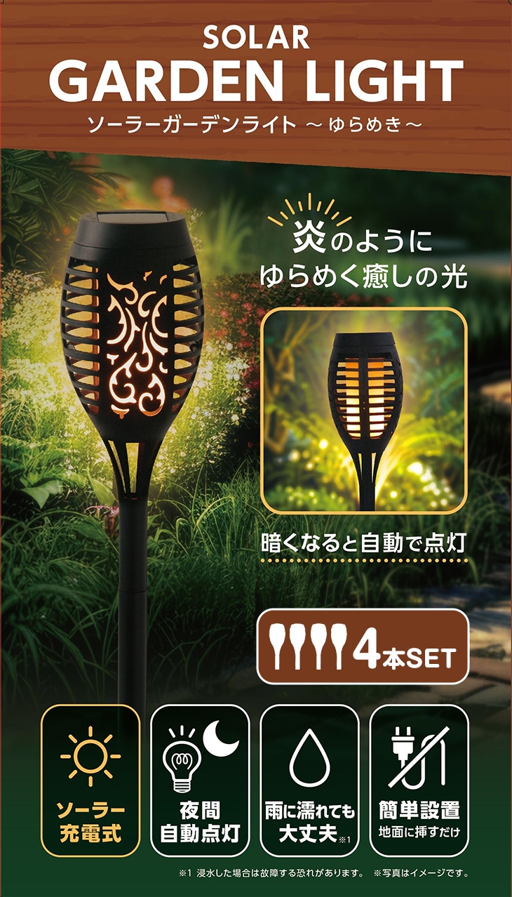 「夜のお庭を華やかにしたい」「電気代をかけずにライトアップを楽しみたい」そんな願いを叶える、炎のようにゆらめくガーデンライトです。本物の火が灯っているかのような、温かみのある光の演出が、毎晩のご帰宅を優しく迎えてくれます。4本セットなので、アプローチや花壇をトータルコーディネート可能です。