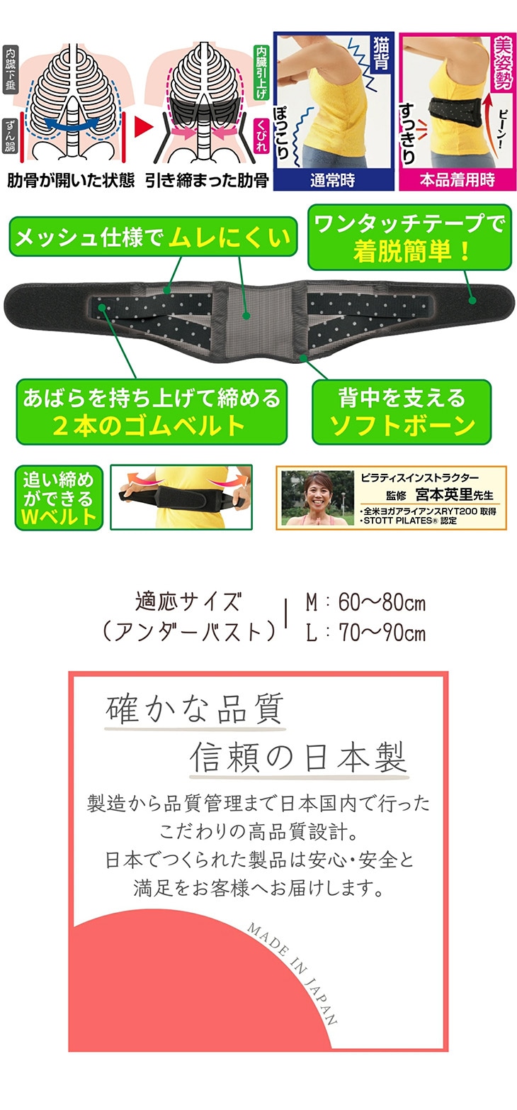 「猫背が気になる」「実年齢より老けて見られる」そんな悩みの根本にアプローチするのが、ピラティスインストラクター・宮本英里先生監修の美姿勢ベルトです。美しさの鍵は「あばら」の位置。広がりがちなあばらをグッと引き上げ、正しい位置へと導くことで、着けた瞬間に背筋がピーンと伸びる感動を届けます。