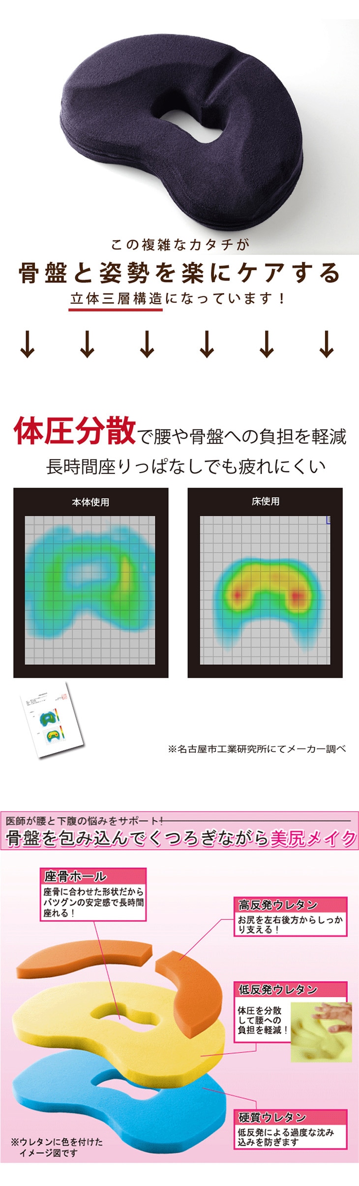 独自の立体3層構造。長時間座っても疲れにくい