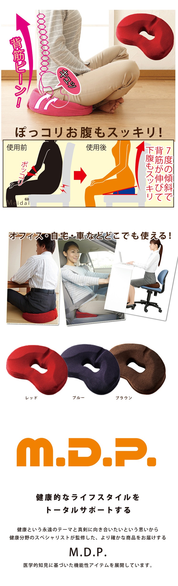 「デスクワークで腰が重い」「ついつい姿勢が崩れてしまう」そんなお悩みに。整形外科医・勝野浩先生監修の、座るだけで骨盤周りをキュッと引き締める高機能クッションです。計算された「7度の傾斜」が骨盤を正しい位置へと導き、座るだけで背筋が伸びた美しい姿勢を自然にキープ。ポッコリ下腹対策にも効果的です。
